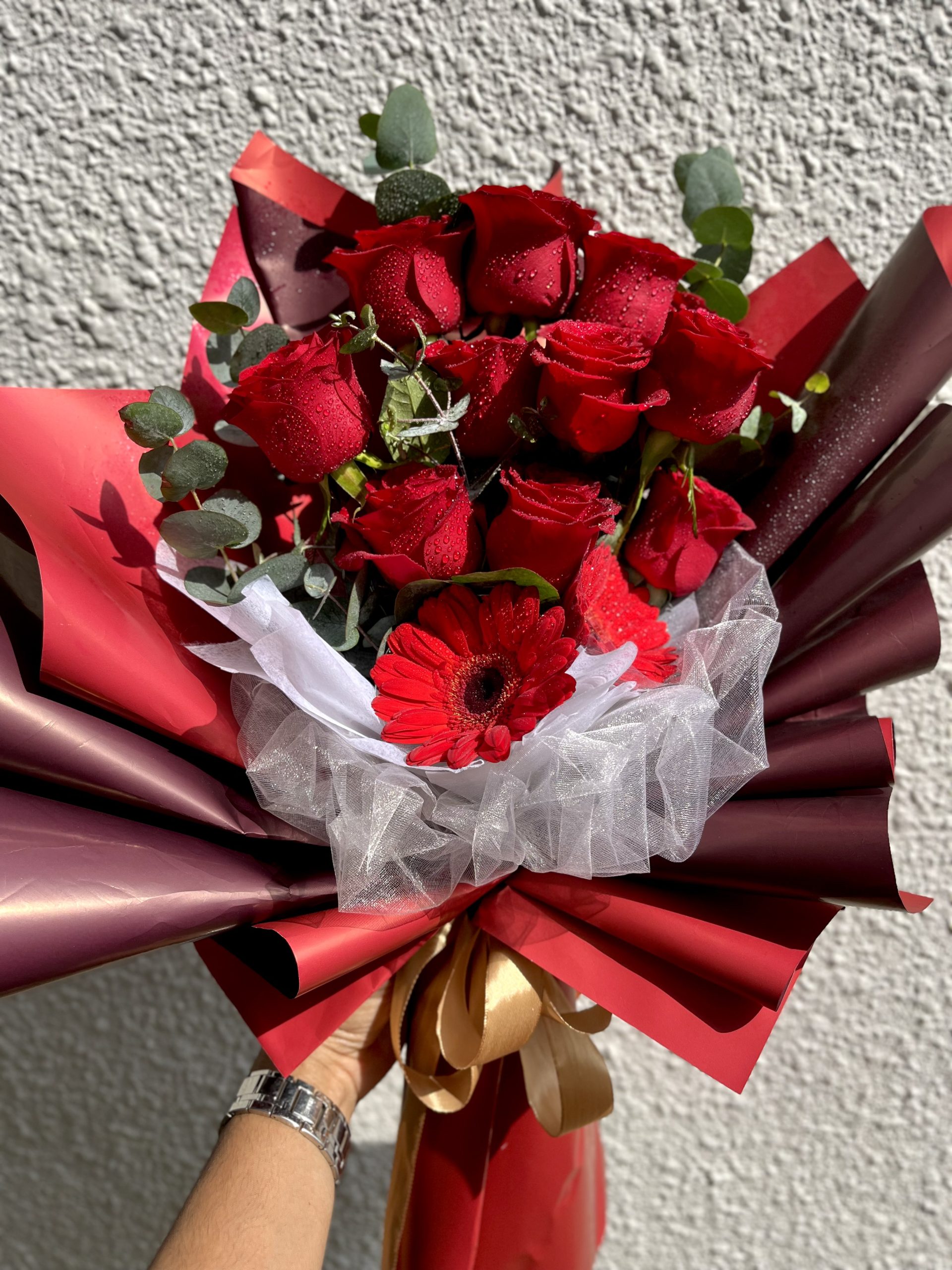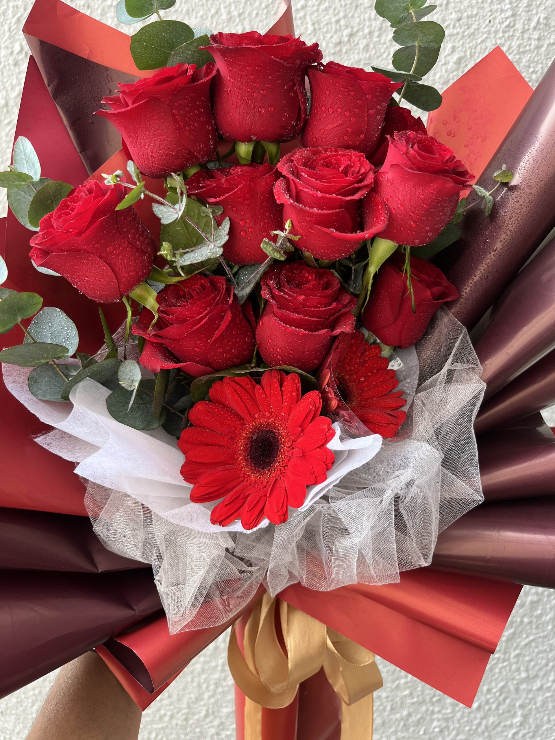 10 royal red roses / mixed blooms of daisy gerberras / eucalyptus